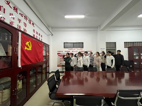 活动现场为新发展党员佩戴党员徽章。王丽娟带领新发展党员面向党旗庄严宣誓,用铮铮誓言表明对党忠诚、为民服务的初心使命。