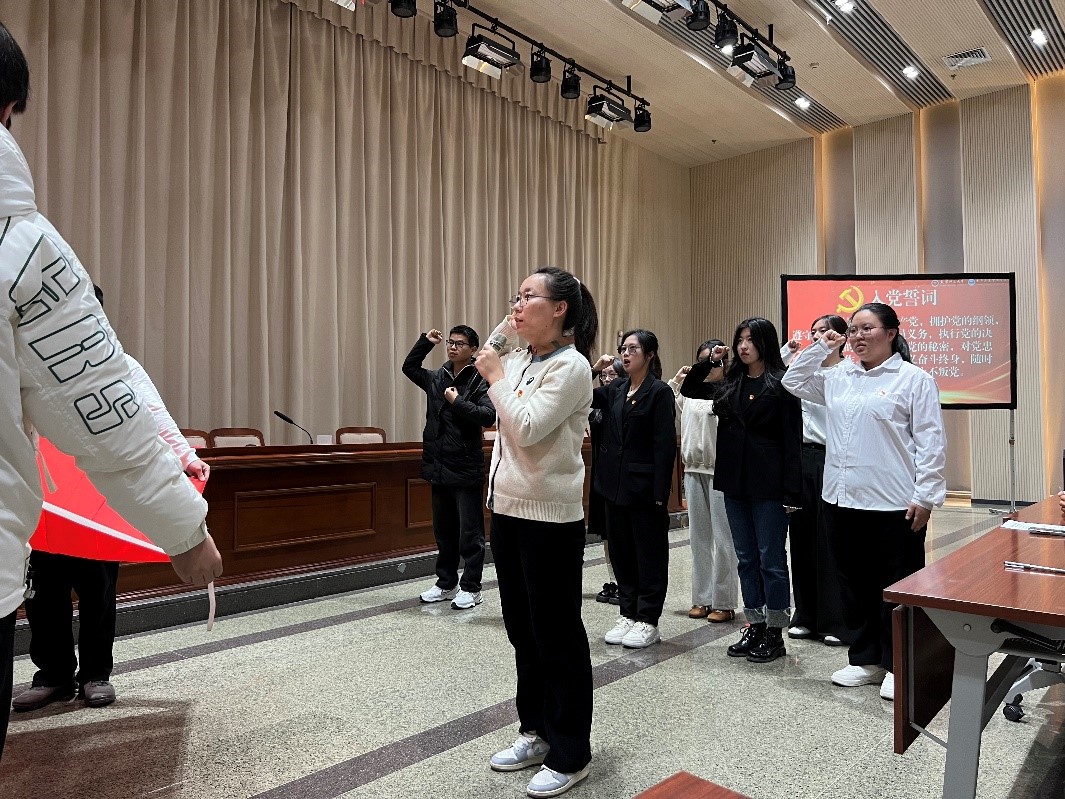 仪式上,团委书记宣读新发展党员与团员名单,老师们亲手为新发展党员佩戴党员徽章,为新发展团员佩戴团徽、发放团员证。宣誓环节,现场新党员、新团员面向党旗、团旗庄严宣誓,誓言铿锵,彰显青春担当。