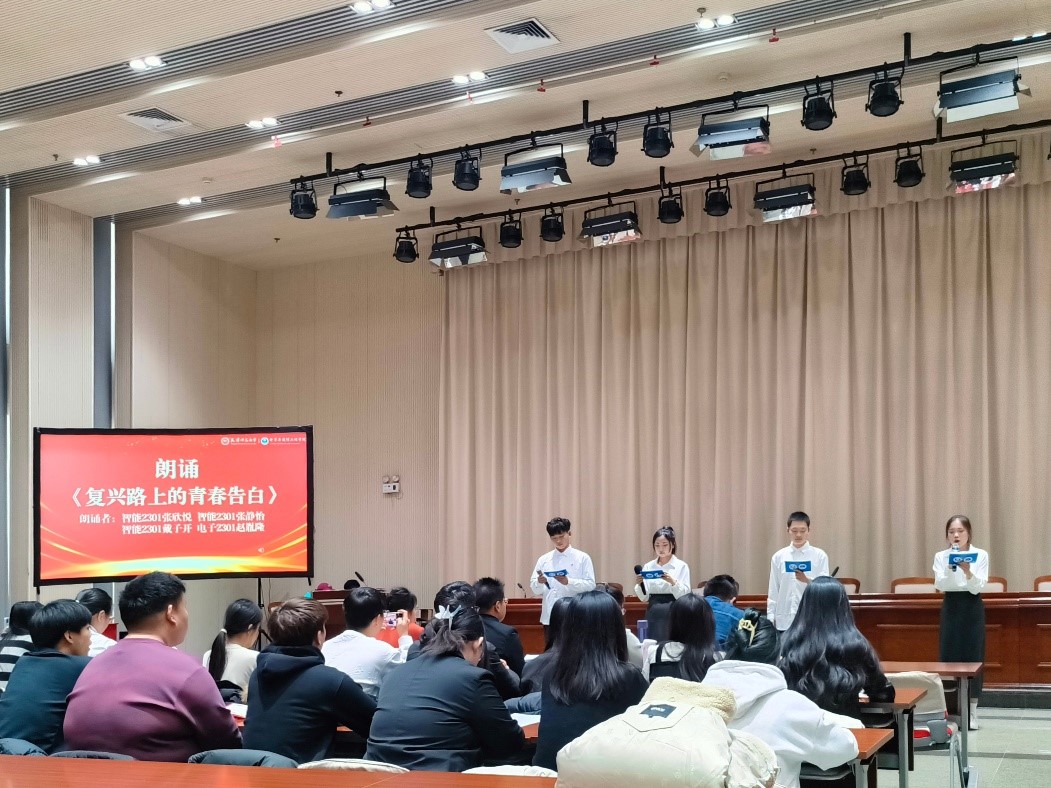 仪式上,23级的团员代表深情朗诵《复兴路上的青春告白》,尽显青年团员的蓬勃朝气与使命感。随后全场齐唱《光荣啊!中国共青团》。