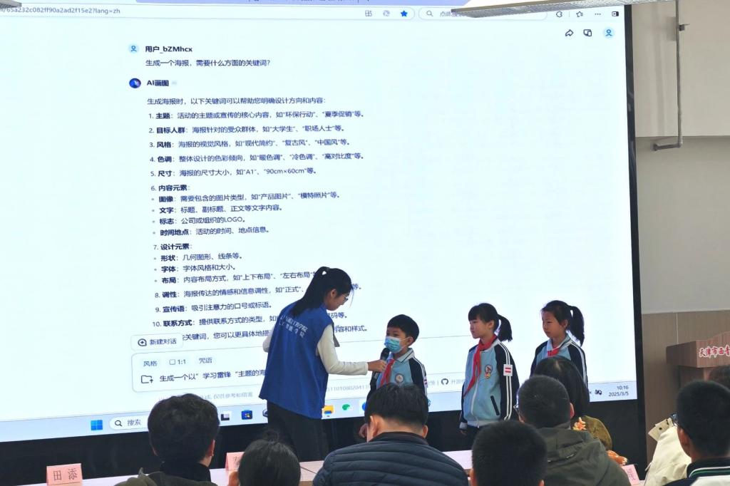在随后的AI应用体验环节,科普讲解志愿者邀请了现场听讲的员工们上台亲身参与互动,体验人工智能技术的实践操作。志愿服务团引导员工利用AI工具,根据提供的关键词生成雷锋主题的海报,并通过描述生成李白讲解视频。人工智能平台在极短的时间内就生成了精美的作品。现场的老师和同学们对此赞叹不已。这些互动体验不仅让员工感受到人工智能的强大功能,也激发了他们的创造力和想象力。
